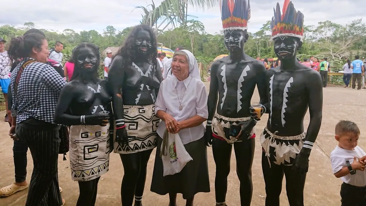 La fiesta del aniversario del distrito (69 años) no está secularizada, sigue unida al patrón San Antonio y al recuerdo de la llegada a este lugar del franciscano canadiense Medardo André en 1953. En la noche cultural, los alumnos del colegio primario representan ese momento fundacional del pueblo: el misionero con alba y barba bajando del bote. Es algo encantador que en otros lugares del Vicariato se ha perdido. Y desde luego, el p. Medardo debió ser todo un personaje; elegido por el primer obispo para iniciar la misión en el Putumayo, carácter fuerte, muy inteligente… Dejó su huella aunque solo permaneció cuatro años.