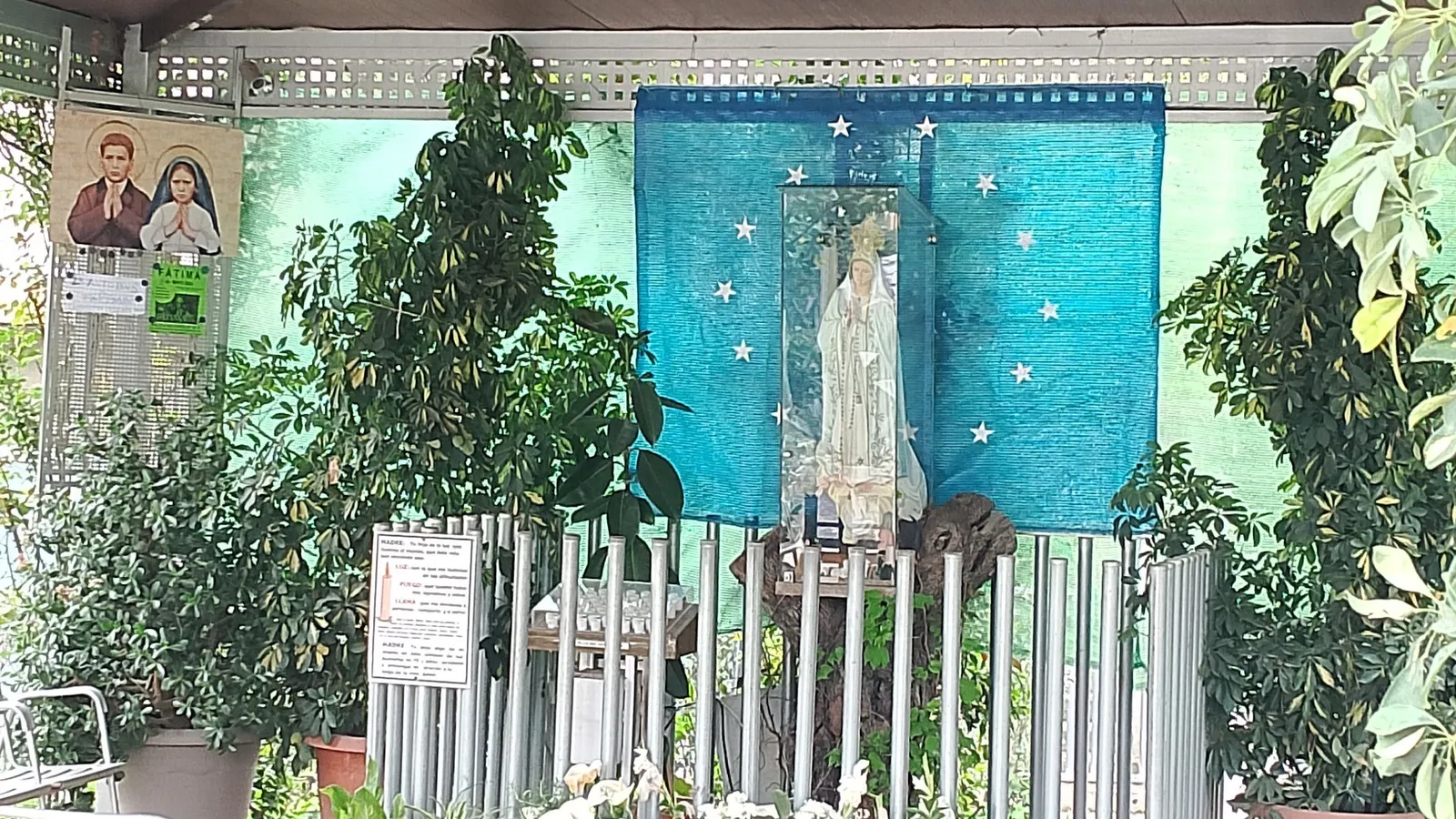 Al fondo, a unos metros, hay una especie de templete abierto. Sencillo pero muy bien concebido, con sillas y una primorosa ornamentación vegetal; en el centro, una urna de cristal con una imagen de la Virgen de Fátima. Y habitualmente alguien orando. De modo que era eso, esa la presencia que llama, ese es el meollo de ternura que palpita en las entretelas de la ciudad.