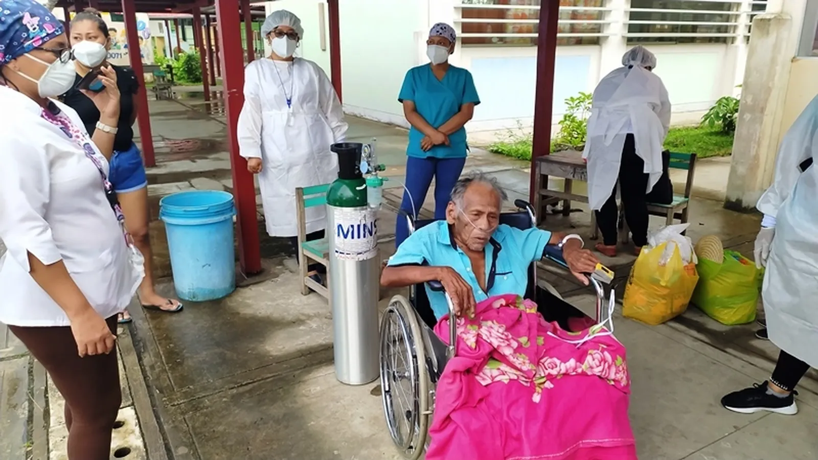 Luis tiene ochenta y tantos años, es menudo, muy delgado y de piel oscuramente amazónica. Está echado en una de las literas que la misión prestó al municipio hace meses para los internos del centro de aislamiento. Lo observo mientras dormita, solo el leve murmullo del concentrador apenas interrumpiendo la quietud del mediodía: la suciedad de la colchoneta, el revoltijo de tapers con restos de comida junto a cajas de medicinas, y una frazada mugrienta cubriendo sus pies.