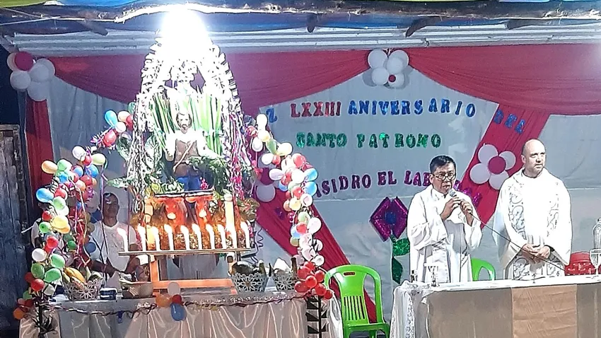Para que no quedara duda, ahí lo ven en el frontis de la cancha escolar: “San Isidro el Labrador”. “Es en Lima donde hemos conseguido la imagen, padrecito, porque en Iquitos nada” – me decían las jefas del festejo. No me extraña: un laico madrileño del siglo XI, el primer casado canonizado de la Iglesia (allá por 1622, antes de ayer), patrono del campo y del mundo rural español… ha llegado hasta la tierra del paiche, los guacamayos y el aguaje. Me quedo a cuadros.