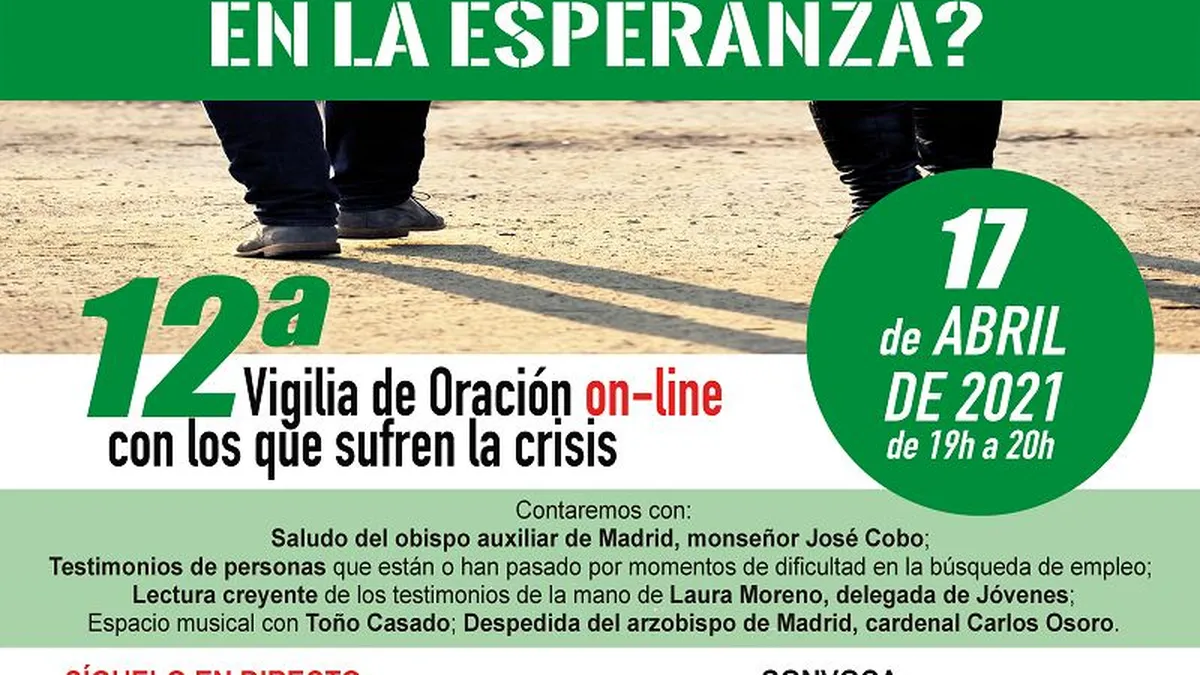 (Archimadrid).- El sábado 17 de abril a las 19:00 horas, en pleno ambiente de Pascua y en la víspera de la Jornada Diocesana contra el Paro, se celebrará virtualmente la XII Vigilia de oración con los que sufren la crisis, que podrá seguire por el canal de YouTube del Arzobispado.