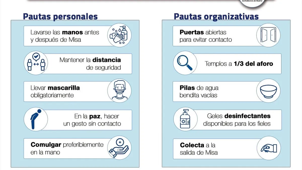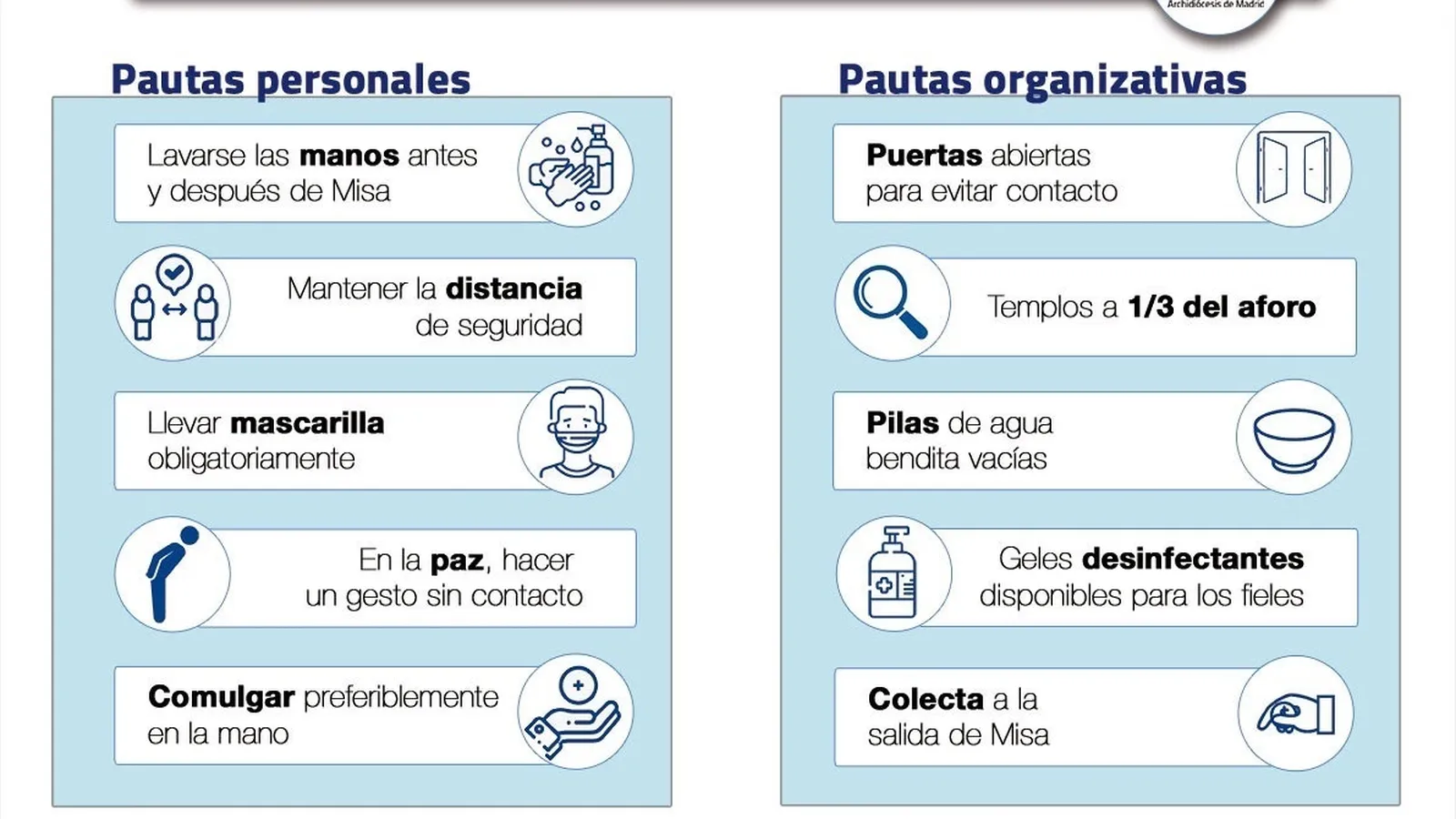 Precisamente, a raíz del anuncio del Gobierno del estado de alarma en Madrid, la diócesis ha informado en su web de la noticia, indicando que “entre las medidas figura de nuevo que, en los municipios de más de 100.000 habitantes con mayor incidencia del coronavirus, los templos no podrán superar un tercio de su aforo, garantizándose en todo caso la distancia mínima interpersonal de 1,5 metros”.