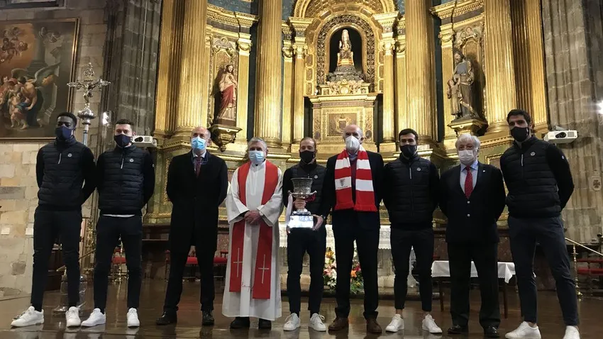 (Diócesis de Bilbao).- “La fe mueve montañas y vaya que, si mueve”, ha comenzado diciendo el presbítero José Mari Delclaux, que ha sido el encargado de hacer el recibimiento a la plantilla del Athletic que se ha acercado a la basílica de Begoña este mediodía, para realizar la ofrenda a la Amatxu, de la Supercopa 2021, lograda este domingo en Sevilla. En el acto han estado presentes los cinco capitanes del primer equipo, Iker Muniain, Óscar de Marcos, Iñaki Williams, Mikel Balenziaga y Raúl García, junto a la representación institucional del Club, encabezada por José Ángel Iribar y el presidente de la entidad, Aitor Elizegi. También han asistido el vicepresidente, Mikel Martínez, y el director general, Jon Berasategi.