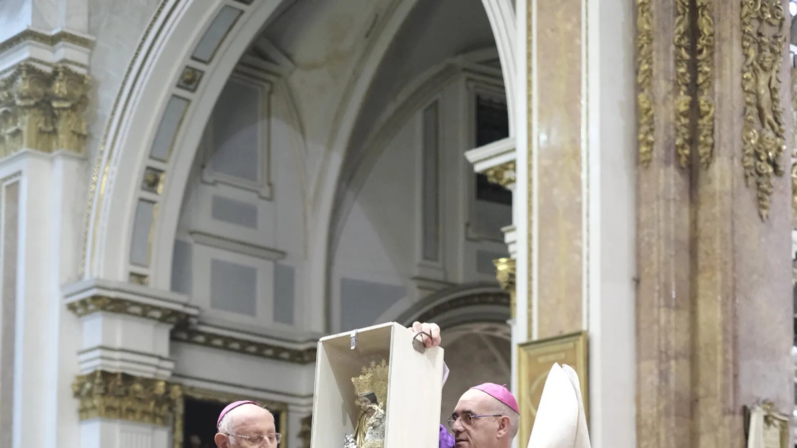 Finalizada la Eucaristía, el vicerrector de la Basílica, Álvaro Almenar, le ha entregado al cardenal Antonio Cañizares en nombre de toda la Archidiócesis una réplica de la imagen de la Virgen de los Desamparados, que el Cardenal ha besado. El Administrador Apostólico de la Archidiócesis ha recibido entonces una gran ovación de todos los presentes.