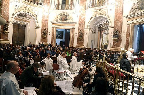 (Archivalencia).- El cardenal arzobispo de Valencia, Antonio Cañizares, en la vigilia de oración anoche del primer viernes de mes con jóvenes en la Basílica de la Virgen de los Desamparados, les animó a "atreveos a ser santos" y a "dejaos querer tal y como sois por Jesucristo, que os ama a tope; ya más es imposible".