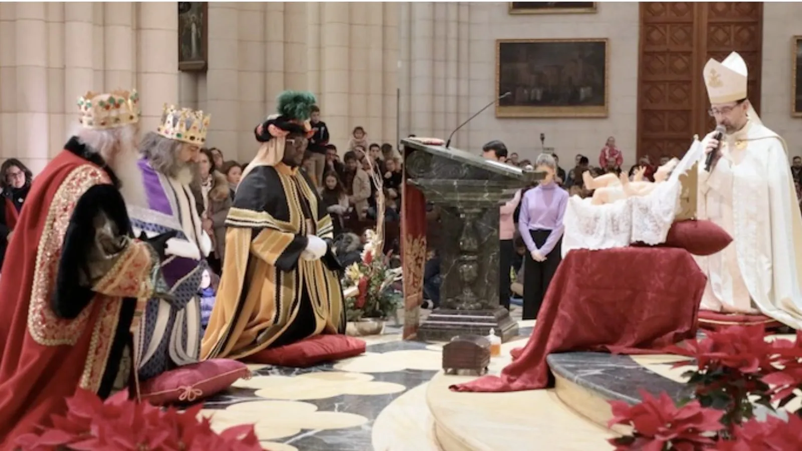 Una vez llegados al altar, los de Oriente se han arrodillado para adorar al Niño Dios. Un espacio aprovechado por el arzobispo de Madrid para invitar a los presentes a hacer un ratito de oración, en silencio, para acoger «a los Magos que vienen de Oriente, y lo primero que hacen es ponerse de rodillas delante de Jesús. Pues nosotros también vamos a adorar, cada uno, al Niño Jesús».