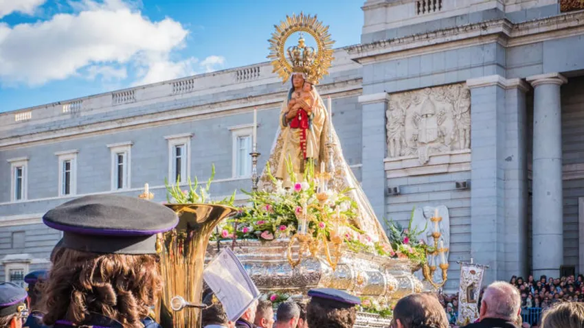 Antes de la misa, la Virgen procesiona por la calle Bailén hasta colocarse en la explanada al lado del altar, donde se va a celebrar la eucaristía, presidida por el cardenal Osoro, acompañado de sus obispos auxiliares, del arzobispo emérito, cardenal Rouco Varela, del cardenal claretiano, Aquilino Bocos, del Nuncio, Bernardito Auza, de los vicarios, cabildo y sacerdotes madrileños.