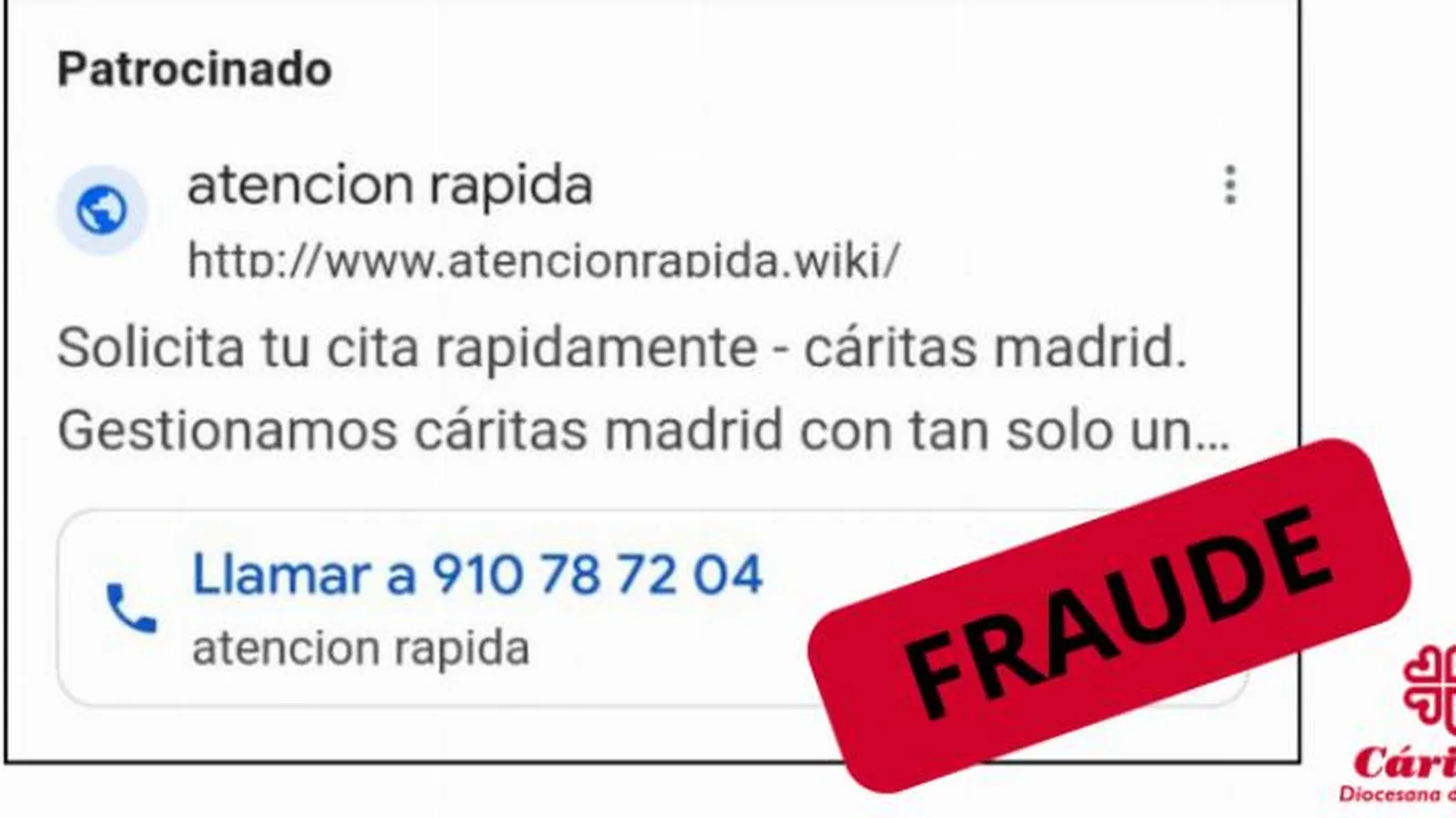 (Achimadrid).- Cáritas diocesana de Madrid informa que el número de teléfono 91 078 72 04 que se anuncia en web como atención rápida - con distintas extensiones como online o wiki- para solicitar cita es un timo. «No pertenece a ninguna de nuestras extensiones y deriva a un servicio de cobro de llamadas que nada tienen que ver con nuestra entidad».