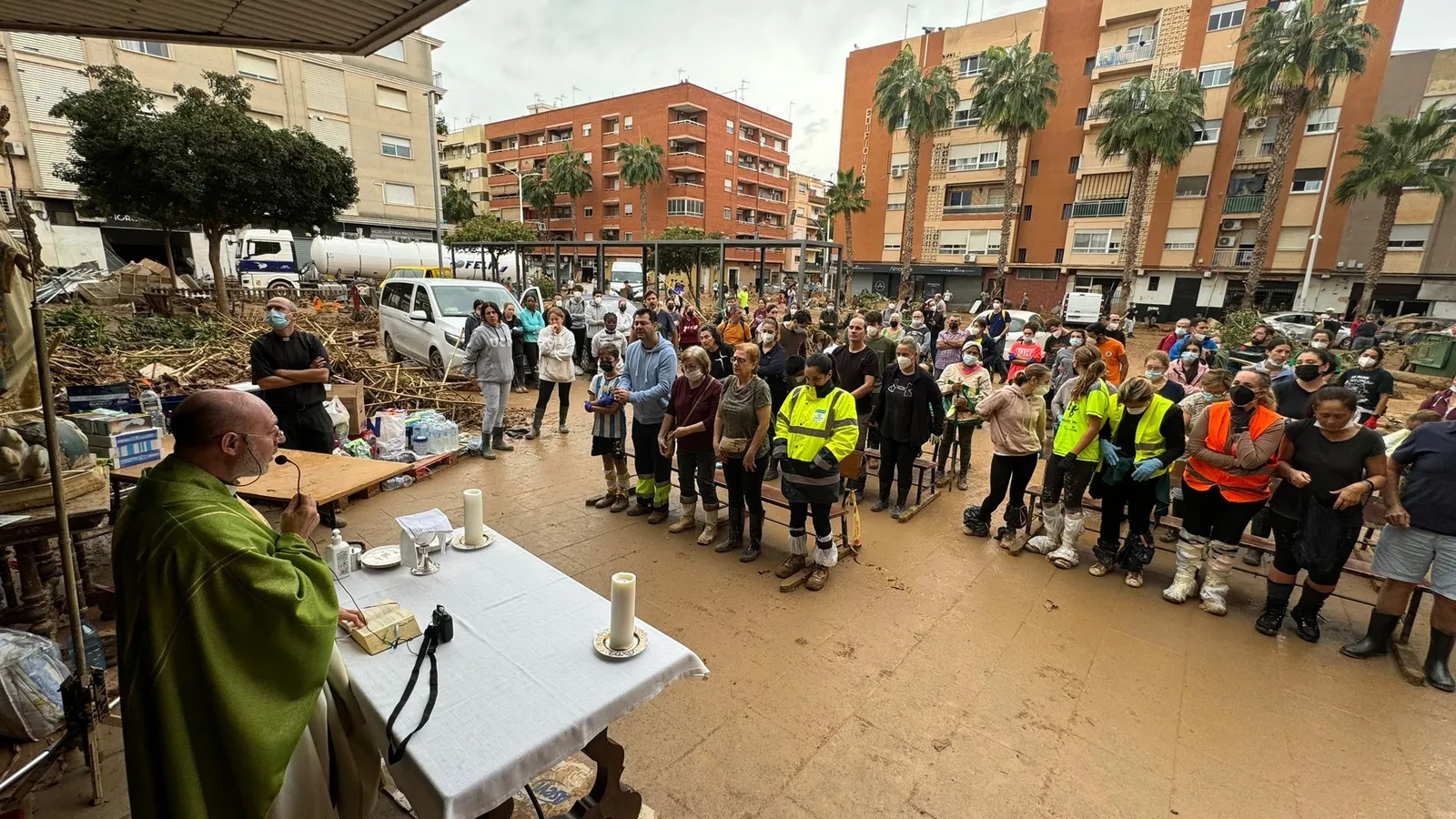 (FLAMA).- Entre cañas de río, pilas de botellas de agua para ser repartidas a los vecinos con menos recursos y sacos de pienso para gatos es cómo se celebró la misa del pasado domingo en la plaza de la parroquia de María Madre de la Iglesia de la población de Catarroja, en la comarca valenciana de l'Horta Sud y una de las más golpeadas por la DANA. La escena —que sucedía mientras, alrededor, decenas de voluntarios y militares seguían retirando coches y barro—, se repetía, al aire libre, en otras localidades devastadas por la catástrofe en la Comunidad Valenciana y volverá el próximo domingo “como un signo de luz en medio de la oscuridad”, como destaca el acólito y feligrés Joan Albert Magrané, de 39 años y residente a pocos metros del templo catarrogí.