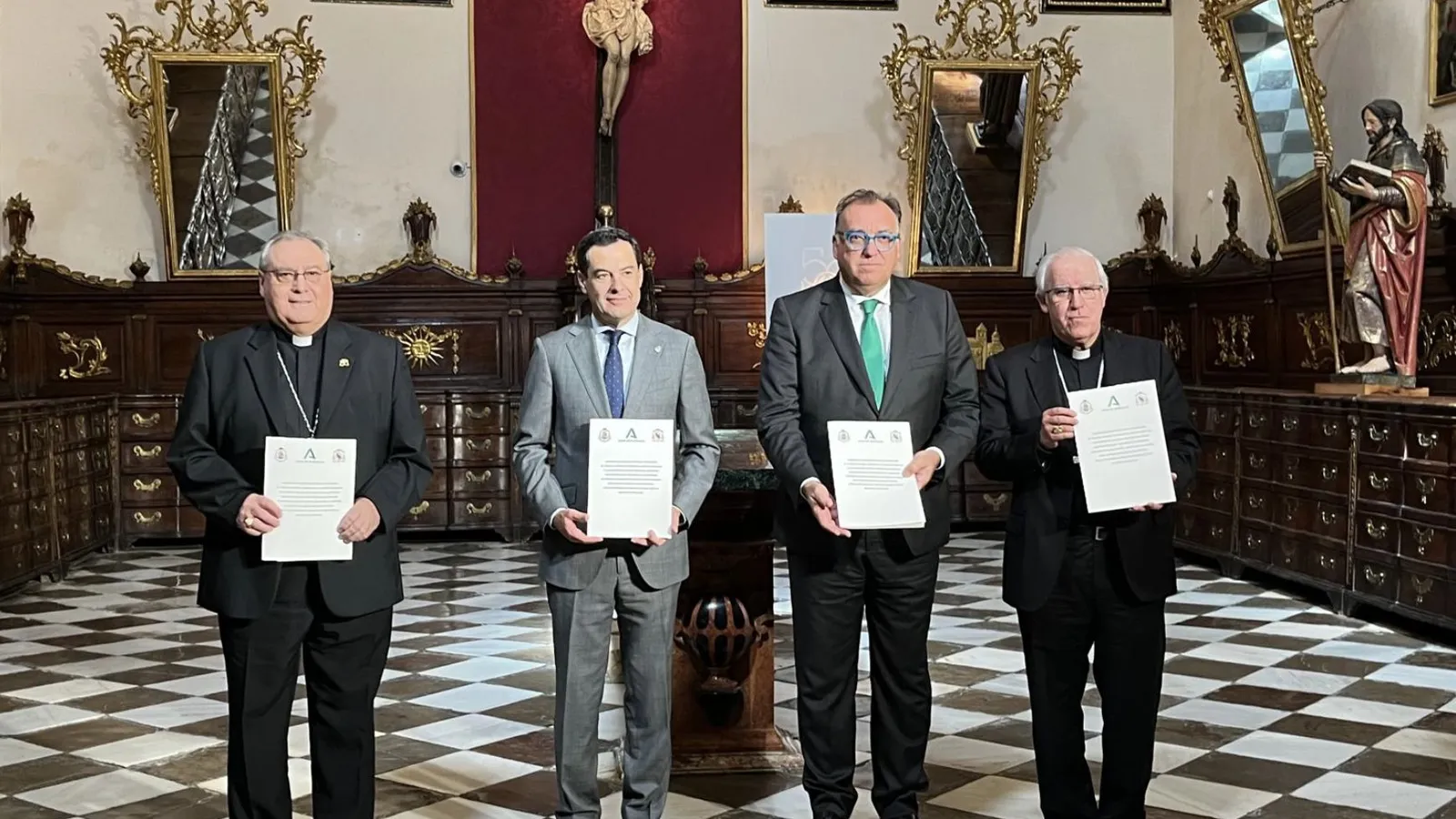 La firma del convenio contó con la asistencia del presidente de la Junta de Andalucía, Juan Manuel Moreno y fue rubricado por los arzobispos de Granada, monseñor José María Gil Tamayo, y de Sevilla, monseñor José Ángel Saiz Meneses, como titulares de ambas provincias eclesiásticas; y con el consejero de Turismo, Cultura y Deporte, Arturo Bernal. Asistió monseñor Ramón Valdivia, obispo auxiliar de Sevilla y delegado de Patrimonio en la Asamblea de los Obispos del Sur.