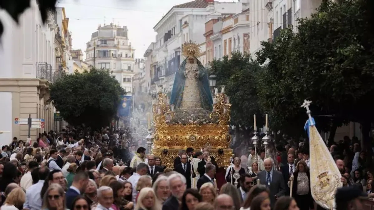 Más de 1.500 costaleros transportan los 36 pasos de las imágenes marianas que pasan por la carrera oficial, entre la Plaza de la Asunción a la calle Eguiluz, y más de 40 bandas ponen la música a la que está considerada la mayor procesión conocida hasta la fecha en Jerez.