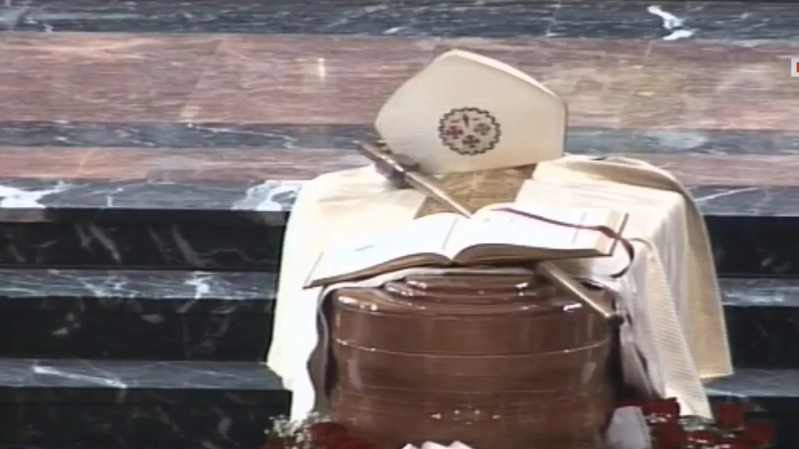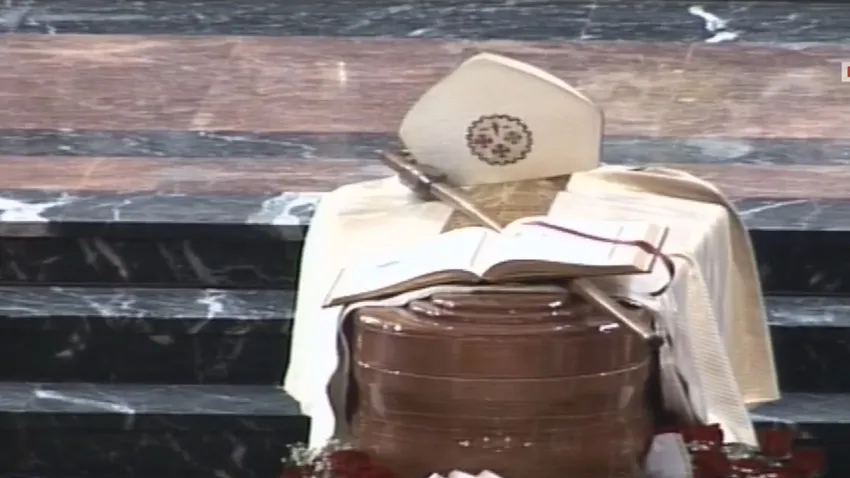 Se coloca el cadáver del obispo de espaldas al altar y de cara al pueblo; luego, se enciende el cirio pascual. A continuación, se colocan sobre el féretro la casulla, la mitra, el báculo pastoral y el evangeliario. Mientras se coloca la casulla y la mitra, el obispo dice: