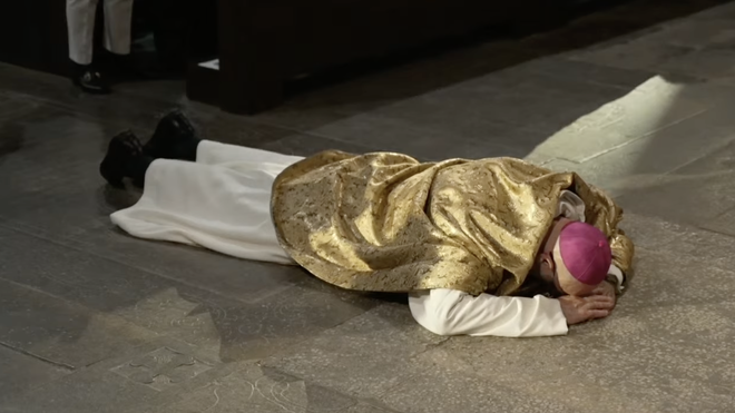 Tras la homilía, el examen de la fe del nuevo obispo ante el pueblo, las letanías de los santos, mientras el obispo electo yace por tierra, la imposición de las manos, la plegaria de ordenación y la entrega de las insignias episcopales. Con ellas, se sienta en la cátedra antigua y recibe el ósculo de la paz de todos los obispos presentes. Y ya preside la eucaristía.