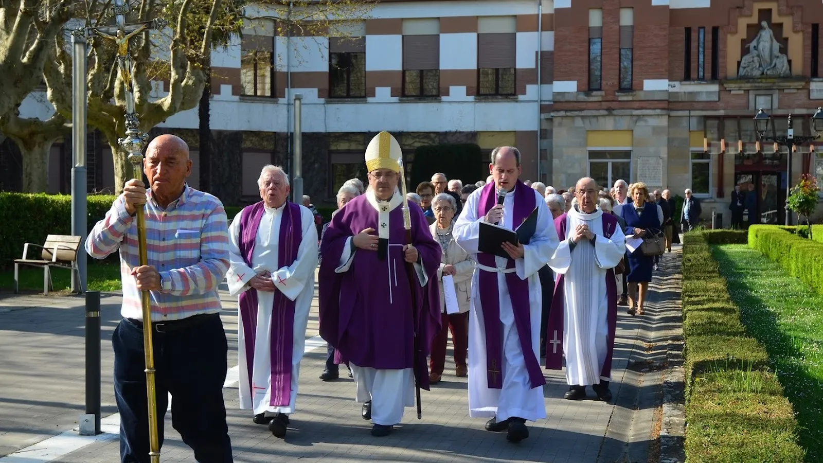 La Casa de Misericordia ha celebrado esta mañana el Año Jubilar de la Esperanza con una procesión por los jardines y, a continuación, una Eucaristía celebrada por el arzobispo de Pamplona y obispo de Tudela, Monseñor Florencio Roselló Avellanas, acompañado del vicario general, Miguel Larrambebere Zabala, y de los sacerdotes Nacho Urdangarín y José Simón Suescun.