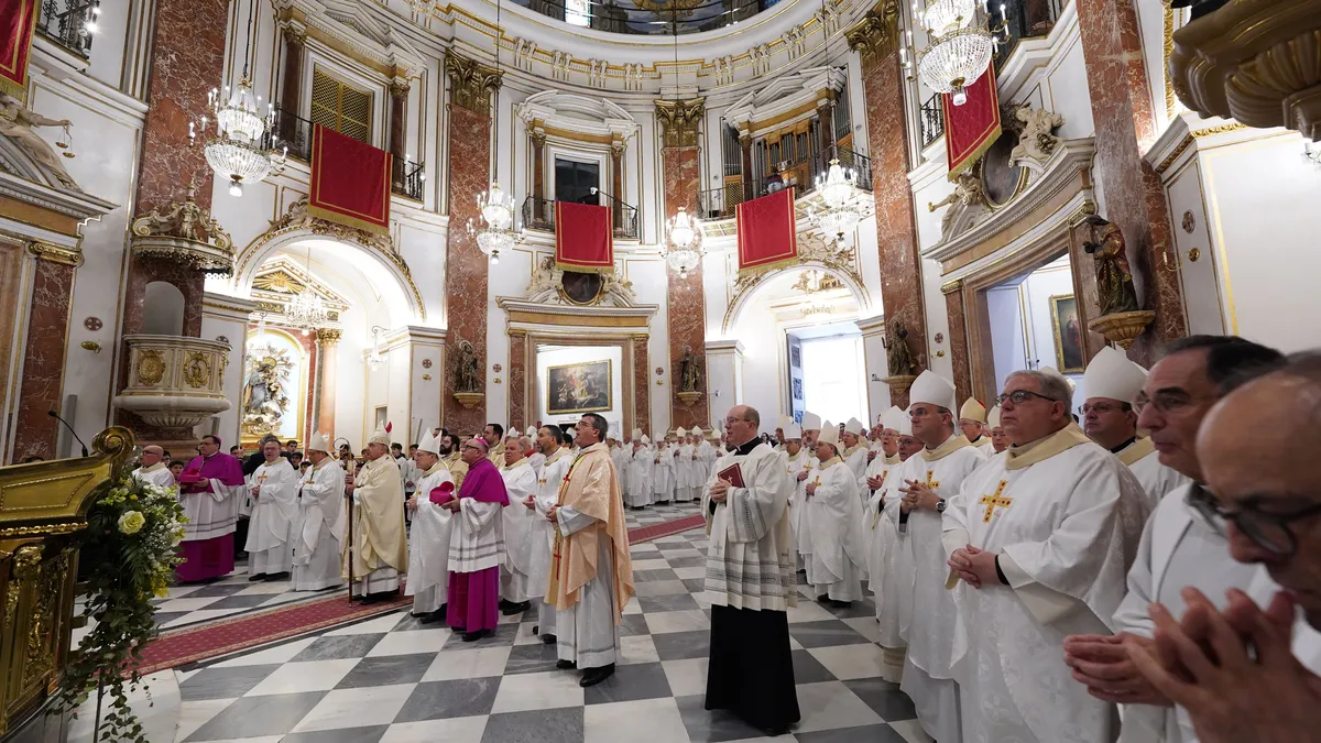 Fernando Ramón y Arturo Javier García se han dirigido hacia la Basílica, desde el Palacio Arzobispal, acompañados por todos los obispos concelebrantes en la solemne misa de ordenación que tiene lugar en la Seo, presidida por el Arzobispo de Valencia y concelebrada por el Nuncio del Papa en España, mons. Bernardito Auza, junto a más de 40 Obispos procedentes de toda España.