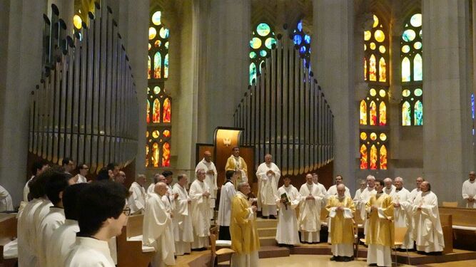 Más de 1.000 personas se han reunido esta tarde en la basílica de la Sagrada Familia para participar en la celebración eucarística, que ha comenzado unos minutos después de las 20 h. Han participado en el presbiterio los vicarios episcopales y los delegados diocesanos, entre otros presbíteros y diáconos. También se han sumado más de 20 seminaristas del Seminario Conciliar de Barcelona.