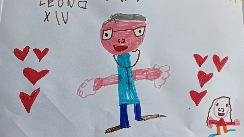 En uno de los dibujos que le enviaron se observa a León XIV saliendo al balcón central de la Basílica de San Pedro, junto al cardenal protodiácono Dominique Mamberti, que fue quien pronunció el 'Habemus Papam'. En otro se distingue la cruz pectoral y aparece rodeado de corazones.