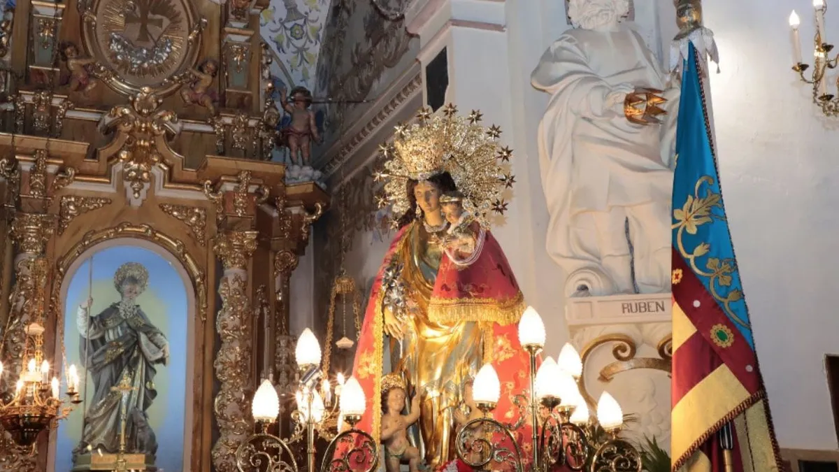 La Mare de Déu fue recibida anoche por la imagen de San Juan Bautista de la parroquia y la real senyera del altar de Sant Vicent del Mercat.