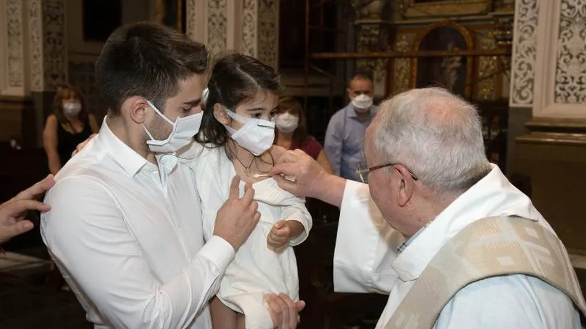 La parroquia de San Esteban Protomártir de Valencia ha acogido hoy, sábado, con todas las medidas sanitarias establecidas, el primer bautizo después de dos meses y medio de estado de alarma en los que se ha anulado o pospuesto un centenar de ellos.