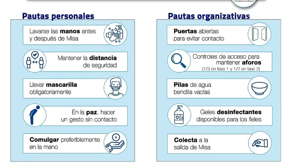 Como se ha estado haciendo desde que se retomó el culto con pueblo, de acuerdo con las pautas fijadas por la CEE, en los templos se controlan los accesos para evitar aglomeraciones, es obligatorio el uso de mascarilla, las pilas de agua bendita continúan vacías y se ofrece gel desinfectante.