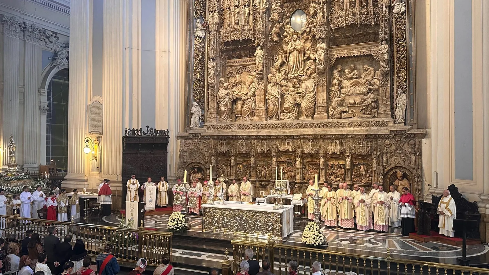(Archicompostela).- La Basílica del Pilar de Zaragoza acogió este domingo la tradicional misa solemne en honor a la Virgen del Pilar, patrona de la ciudad y de la Hispanidad, en el acto central de las fiestas zaragozanas. La celebración fue presidida por mons. Francisco José Prieto Fernández, arzobispo de Santiago de Compostela, quien concelebró junto al arzobispo de Zaragoza, Mons. Carlos Manuel Escribano Subías, otros obispos y numerosos sacerdotes y fieles procedentes de distintos puntos de España. Por parte del Cabildo Metropolitano de la Catedral de Santiago de Compostela estuvo presente en los actos Víctor Suárez Gondar.