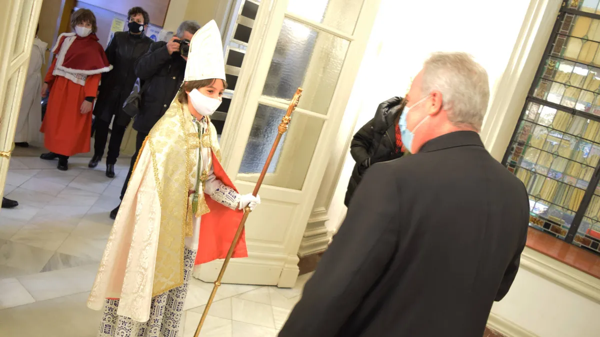 Ataviado con capa pluvial, mitra, báculo, guantes, pectoral y anillo, Rodrigo Rojo Palacín ha sido recibido esta mañana en audiencia por el arzobispo de Burgos, don Mario Iceta Gavicagogeascoa, en su calidad de obispillo 2020. Junto a él, han mostrado también «respeto y cariño» al pastor de la diócesis su secretario, Íñigo Cerdá Esteban, y su vicario, Sergio Sáiz Córdoba. Como cada 28 de diciembre, la escolanía de los Pueri Cantores ha vivido su tradicional fiesta, dando bienvenida a los nuevos miembros de la agrupación, que han agasajado al arzobispo con uno de sus cantos litúrgicos.
