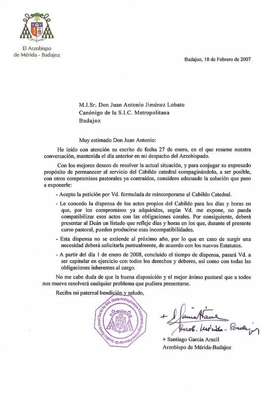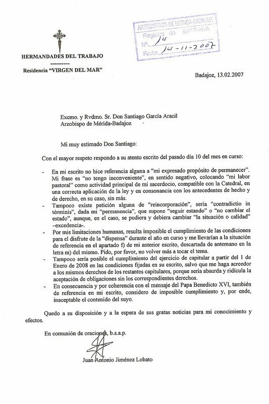 m) No tengo inconveniente en permanecer al servicio del Cabildo Catedralicio sin menoscabo de mi labor pastoral, con actividades imprevisibles obviamente, avalada, en su caso, por la correspondiente dispensa, que evite los motivos de la citada y no aceptada renuncia.Es mi deseo no crear problemas absurdos y escandalizantes, como alguno reciente, por lo que dejo a su buen criterio la resolución más ética y justa, que ¡ojalá! esté enmarcada en el escrito del Cardenal Ratzinger, que le ofrecí.A la espera de sus gratas noticias, en comunión de oraciones, b.s.a.p.