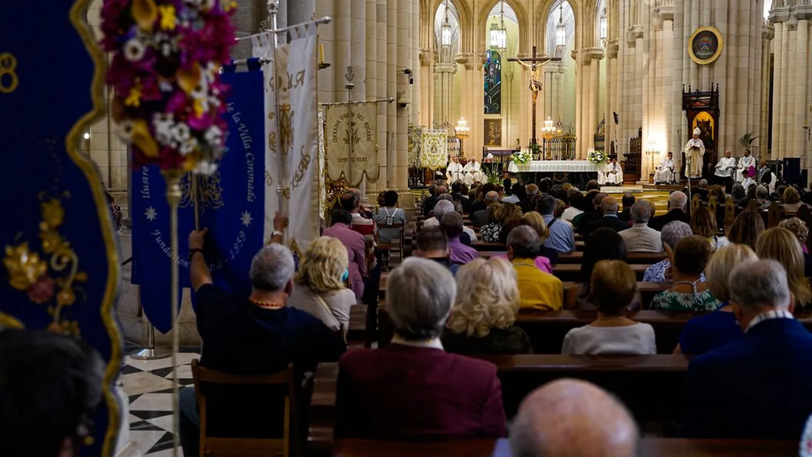 (Archimadrid).- Más de un centenar de hermandades, cofradías y congregaciones se dieron cita en la catedral Santa María la Real de la Almudena este jueves, 8 de septiembre, para acompañar a la Real Esclavitud de la Almudena en su fiesta grande. El día en que la Iglesia universal celebraba la Natividad de la Virgen, en Madrid se vivió una Misa solemne que acogió a representantes de toda la diócesis, pero también de otras de España e incluso del extranjero con vinculación a Madrid.