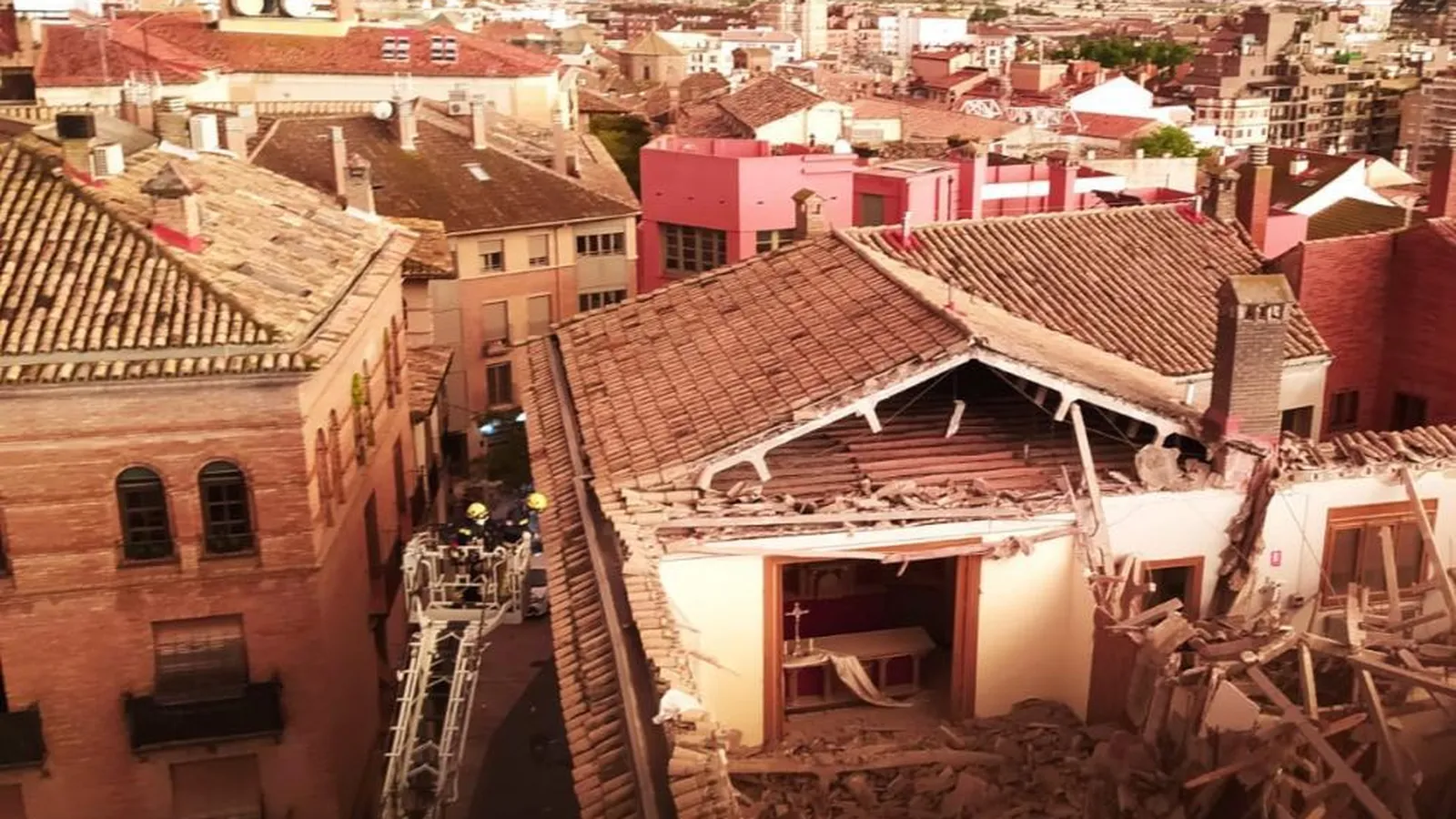 Los bomberos del parque del Ayuntamiento de Huesca han acudido inmediatamente al lugar y a las diez de la noche seguían trabajando allí. Con ayuda de una escalera han accedido hasta la zona afectada para revisarla. El Ayuntamiento ha confirmado que en ese momento no había nadie dentro del obispado. El tejado ha colapsado y se está examinando la estructura y valorando los desperfectos, junto con los responsables de la diócesis.