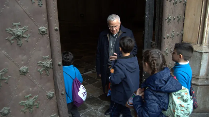 “Un misionero es un superhéroe sin poderes: su poder es ayudar”. Con esta frase espontánea de un alumno de sexto comenzaba a perfilarse el espíritu de la celebración de “Sembradores de estrellas” de este viernes 12 de diciembre en la Catedral de Tarragona. Pero, antes que nada, lo que más llamaba la atención era el gesto inicial del arzobispo Joan Planellas: plantado en la puerta principal, saludaba uno por uno a todos los niños que iban llegando. Más de 100 manos pequeñas estrechadas con la misma calma y cordialidad convertían la entrada al templo en una escena que muchos maestros describían como “única y entrañable”, la imagen de una acogida que servía de puente hacia la celebración.