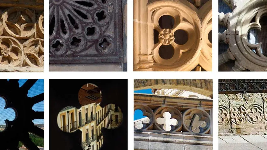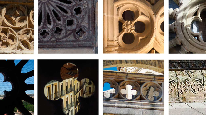 El motivo gráfico elegido es una simplificación del calado cuatrilobulado ejecutado en piedra que aparece entre las bóvedas de la Capilla de la Virgen Blanca, la primera en construirse según la tradición