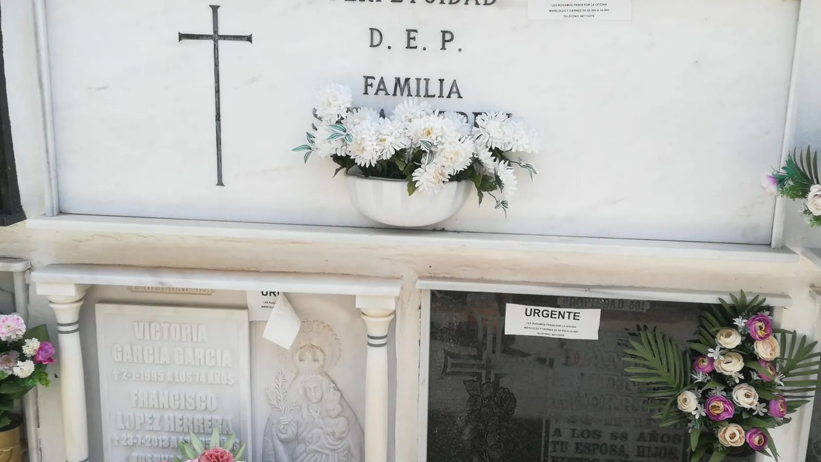 “Urgente. Habiendo sido imposible localizarles, les rogamos pasen por la oficina miércoles y viernes. Teléfono: 687110278”. Son las pegatinas que tapizan las tumbas del cementerio de Vejer. Sería cómico, si no fuese indigno, sobre todo teniendo en cuenta que la empresa que colocó los cartelitos y que gestiona el cementerio pertenece al obispado de Cádiz y la dirige su recientemente despedido ecónomo plenipotenciario, Antonio Diufaín Mora.