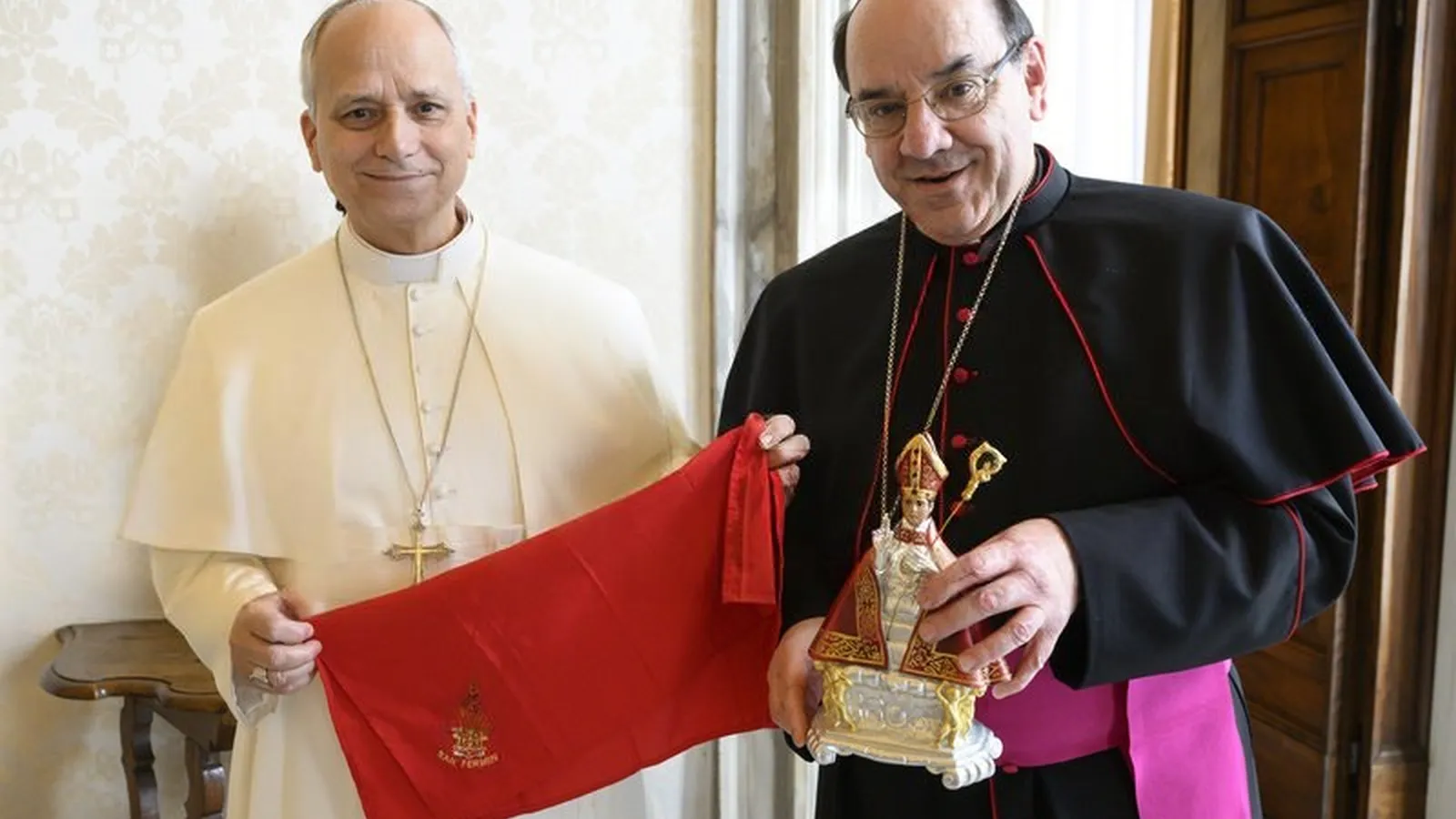 Monseñor Florencio Roselló le obsequió con una figura de san Fermín, un pañuelo rojo y una mano que escapa de unos grilletes, realizada por un preso de la cárcel de Castellón, como símbolo de la libertad. También, y dada la condición de misionero del papa León XIV, le invitó a aprovechar su próxima visita a España para conocer el Castillo de Javier -lugar de nacimiento de san Francisco Javier-, siendo consciente de que no será sencillo dado lo apretado de su agenda.