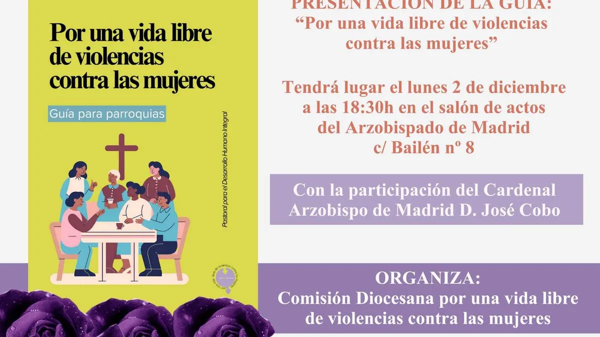 La guía se presentará el lunes 2 de diciembre, a las 18:30, en el Salón de Actos del Arzobispado de Madrid, c/ Bailén, 8. Participará el arzobispo, José Cobo. A partir de esta fecha la guía estará disponible para descargar en https://www.pastoralsocialmadrid.com/libres-de-violencias-contra-las-mujeres-guia-para-parroquias/