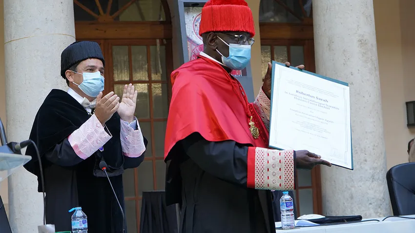 La laudatio ha sido pronunciada por el gran canciller, cardenal Antonio Cañizares, que ha agradecido a la UCV “haber contado entre sus doctores con el cardenal Sarah, precisamente en mi diócesis y la Universidad Católica San Vicente Mártir, que recibe a un humilde y sabio pastor que también sabe de la amargura de la persecución y del gozo del testimonio libre de la fe de la Iglesia en Jesús, su piedra angular, presidida por Pedro y sus sucesores, cuya palabra no está encadenada”.