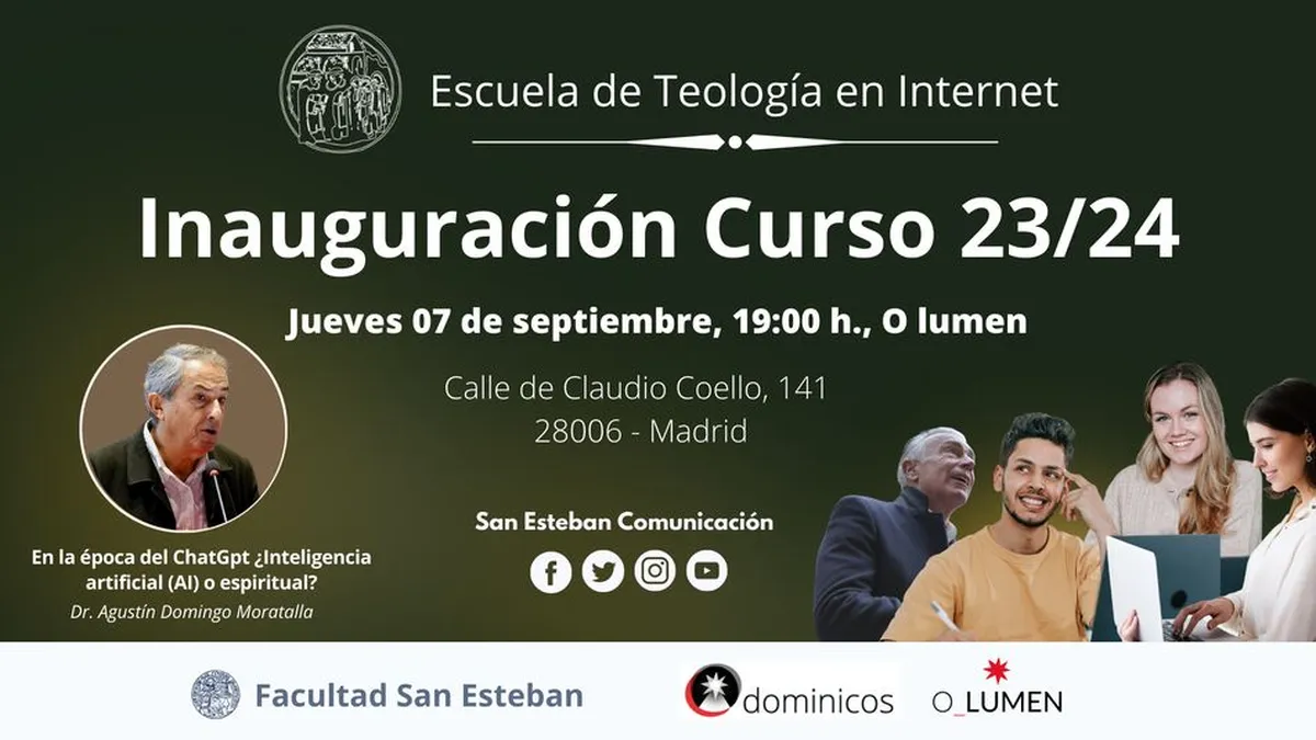 (Facultad San Esteban).- El jueves 07 de septiembre, a las 19:00 (hora de España) en O_lumen (c/Claudio Coello 141, Madrid) tendrá lugar el acto de Inauguración del curso académico 23-24 de la Escuela de Teología en Internet (ETI) de los Dominicos de Hispania, Facultad San Esteban.