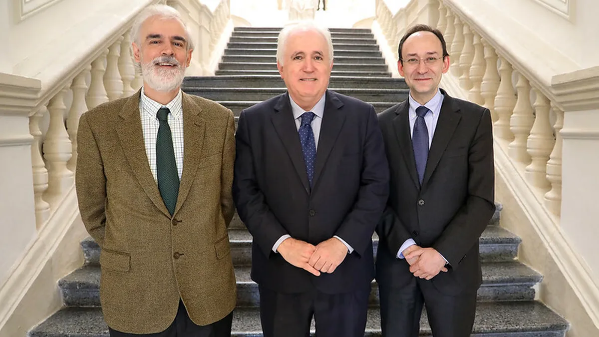 El rector de Deusto José María Guibert (en el centro), acompañado de los rectores de la Universidad Pontificia Comillas, Julio Martínez, (izqda..) y de la Universidad Ramon Llull, Josep Maria Garrell (drcha.)