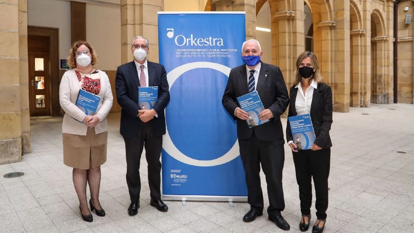 El Informe de Competitividad 2021 analiza cómo se sitúa el País Vasco en términos de bienestar, cómo evoluciona su desempeño económico-empresarial y cuáles serán las palancas para su competitividad futura. El análisis ha sido presentado hoy ante los medios por el rector de la Universidad de Deusto, José María Guibert; el presidente de Orkestra, Iván Martén Uliarte, la directora del Instituto, Mari Jose Aranguren, y la investigadora sénior, Susana Franco.