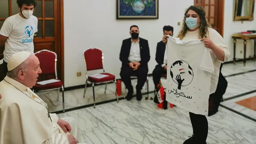 En el primer día de su gira en Irak, el Papa Francisco recibió en la Nunciatura de Bagdad a Scholas junto a jóvenes que le compartieron sus experiencias y le contaron que a través del fútbol, la música y los pinceles pudieron encontrarse.
