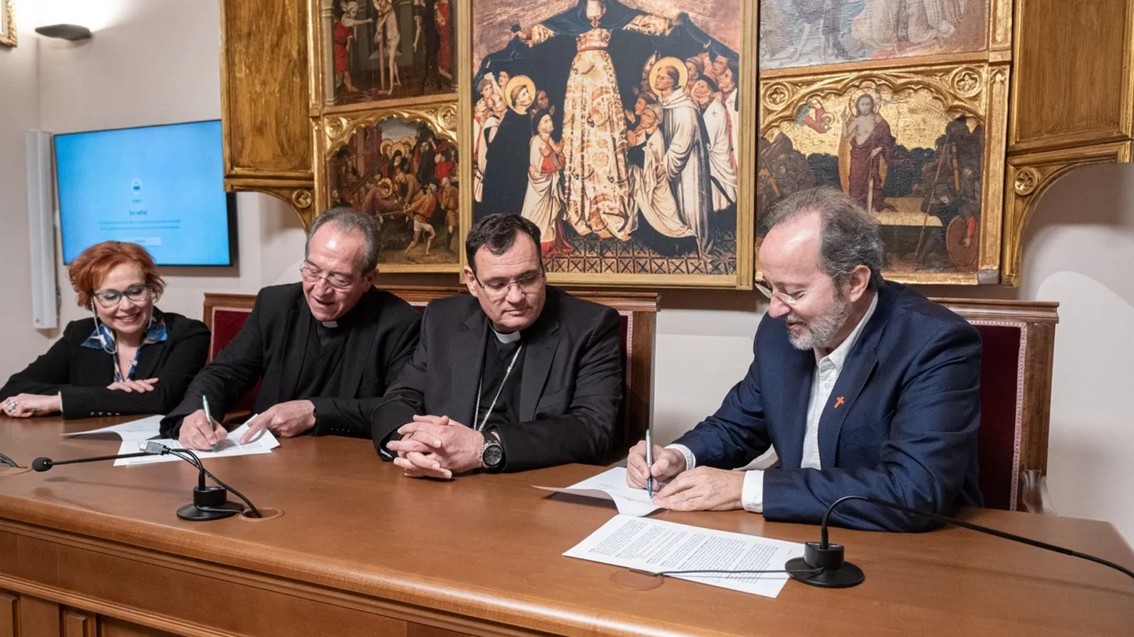 El Centro de Humanización de la Salud San Camilo y la Archidiócesis de Valencia han firmado con convenio de colaboración para la implantación de Centros de Escucha Diocesanos. Un acuerdo rubricado por José Carlos Bermejo, director del Centro San Camilo, y Vicente Fontestad, vicario general de Valencia, en presencia del Arzobispo, monseñor Enrique Benavent, en la sala gótica del obispado valenciano.