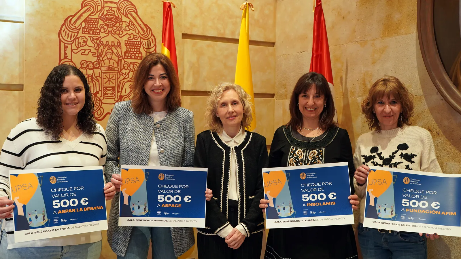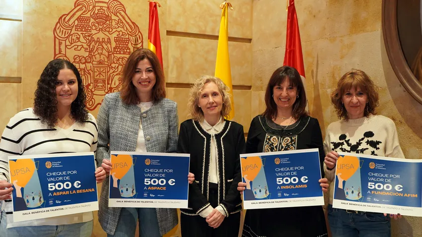 La rectora de la Universidad Pontificia de Salamanca (UPSA), Mirian Cortés, ha hecho entrega esta mañana de la recaudación obtenida en la Gala Benéfica de Talento a Talento a los responsables de las cuatro organizaciones colaboradoras en el evento: ASPACE, Aspar la Besana, Fundación AFIM e Insolamis