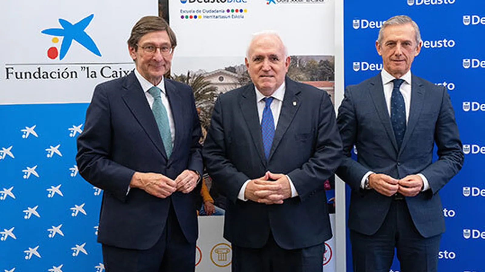 El rector de la Universidad de Deusto, José María Guibert, el presidente de CaixaBank, José Ignacio Goirigolzarri, y el director territorial Norte de CaixaBank, Juan Pedro Badiola, han renovado esta alianza que contempla potenciar la inclusión social de todas las personas con discapacidad, a través de un conjunto de acciones de asesoramiento y consultoría que disminuyan la vulnerabilidad de este grupo. En concreto, en este curso se apostará por la presencia de las creaciones culturales de este colectivo ofertadas a la comunidad universitaria y público en general. Todo ello, en colaboración con los agentes sociales implicados.