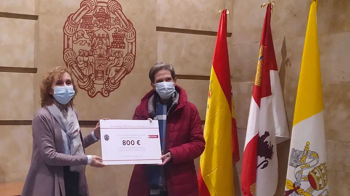 (UPSA).- La rectora de la Universidad Pontificia de Salamanca (UPSA), Miriam Cortés, ha hecho entrega esta mañana a la directora de Cáritas Diocesana de Salamanca, Carmen Calzada de la recaudación de la V San Silvestre Universitaria, organizada desde el Servicio de Deportes de la institución académica. En el acto de entrega también han asistido el vicerrector de Internacionalización y Estudiantes, Juan Manuel Castro, el director del Servicio de Deportes de la institución académica, Alberto Rodríguez.