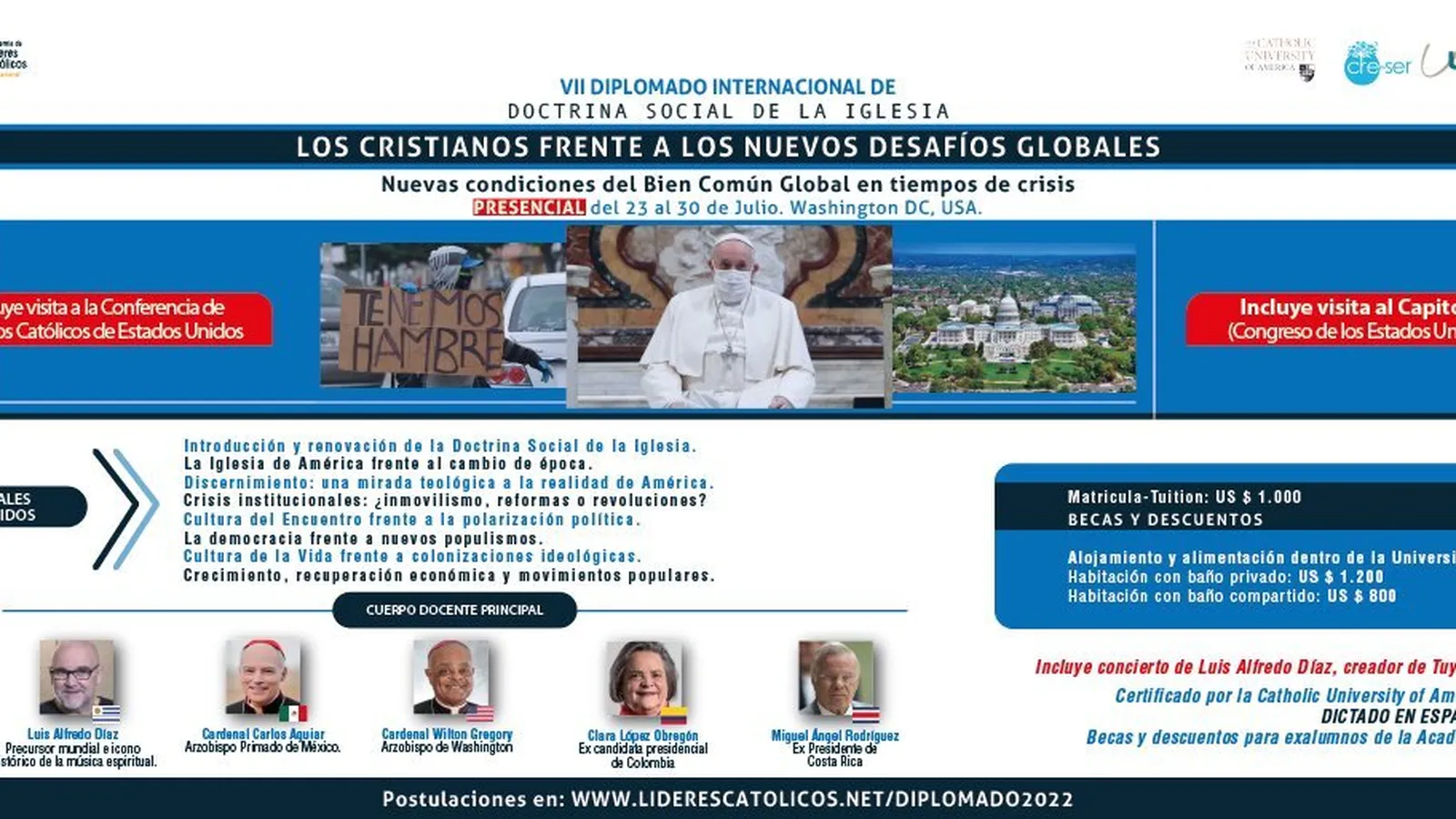 La Academia de Líderes Católicos junto con la Catholic University of America, llevarán a cabo del 23 al 30 de julio en la ciudad de Washington DC, el VII Diplomado Internacional de Doctrina Social de la Iglesia dirigido para líderes políticos, sociales y económicos de la región, y el cual estará dedicado a profundizar en las nuevas condiciones para el Bien Común global en tiempos de crisis y especialmente en la realidad de las Américas.