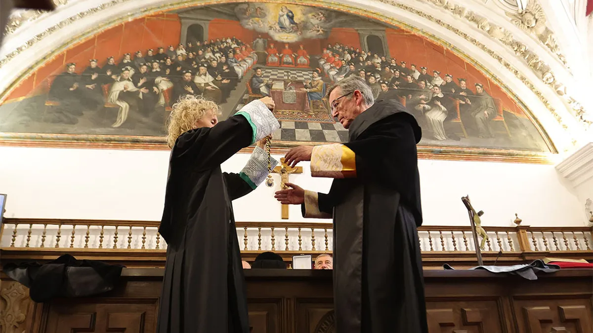 Santiago García-Jalón ha agradecido la labor realizada durante ocho años por su predecesora, Mirian Cortés Diéguez: “Ella es el último eslabón de una cadena de rectores que ha marcado para bien el curso de mi estancia en Salamanca”, ha afirmado. Y ha concluido el evento recordando que “siempre la claridad viene del cielo; es un don: no se halla entre las cosas sino muy por encima, y las ocupa haciendo de ello vida y labor propias”, ha concluido. (Puede leerse el discurso en el documento adjunto).