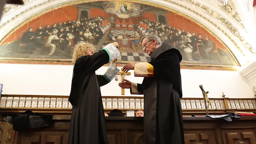 En su intervención, el rector también se ha referido a la transmisión de conocimientos de la universidad, cuyo fin propio se centra en indagar más allá, en señalar los vacíos del conocimiento y en perfilar lo sabido, para acercarse a una sociedad más serena, más justa y más fraterna.