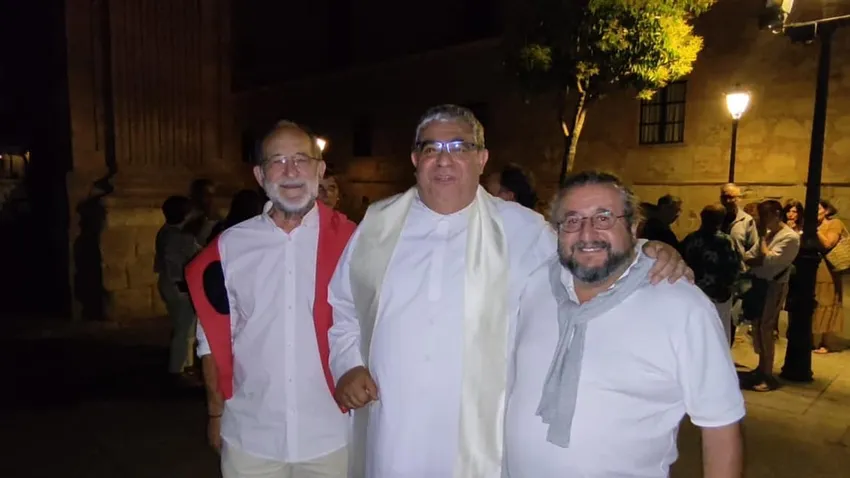 En este contexto, con fotos de amigos de Policarpo, quiero recordar a nuestro amigo Mons. Raúl Berzosa, que tuvo que despedirse y dejar el episcopado de Ciudad Rodrigo (diócesis vecina de Salamanca), porque algunas personasno pudieron (o no quisieron) interpretar bien algunos de sus gestos pastorales. Raúl es ahora vicario pastoral de la inmensa diócesis de Santo Domingo. Hubiera sido para mí un gran gozo que hubiera podido estar con nosotros en esta noche de su amigo Policarpo, de la que dan constancia algunas fotos que siguen, entre ellas esta úlima, en la que J. A. Mateos y un servidor apacemos rodeados por la gran humanidad de Policarpo.