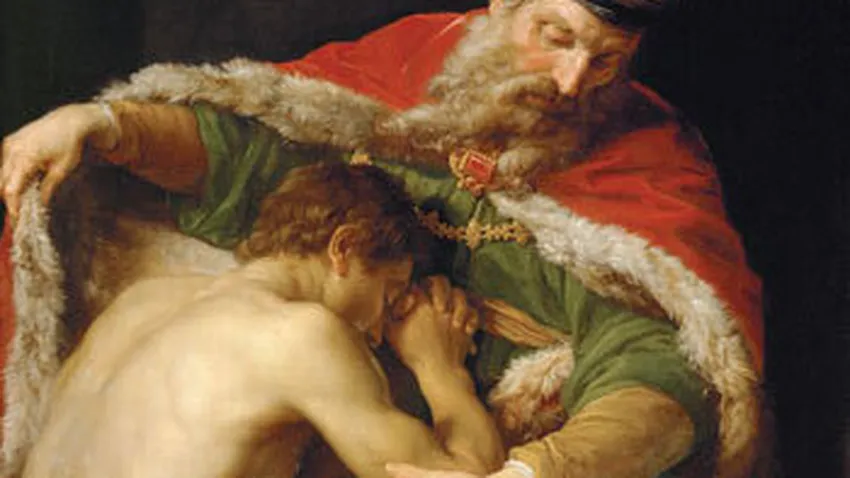Su hijo le dijo: "Padre, he pecado contra el cielo y contra ti; ya no merezco llamarme hijo tuyo. "Pero el padre dijo a sus criados: "Sacad en seguida el mejor traje y vestidlo; ponedle un anillo en la mano y sandalias en los pies; traed el ternero cebado y matadlo; celebremos un banquete, porque este hijo mío estaba muerto y ha revivido; estaba perdido, y lo hemos encontrado."