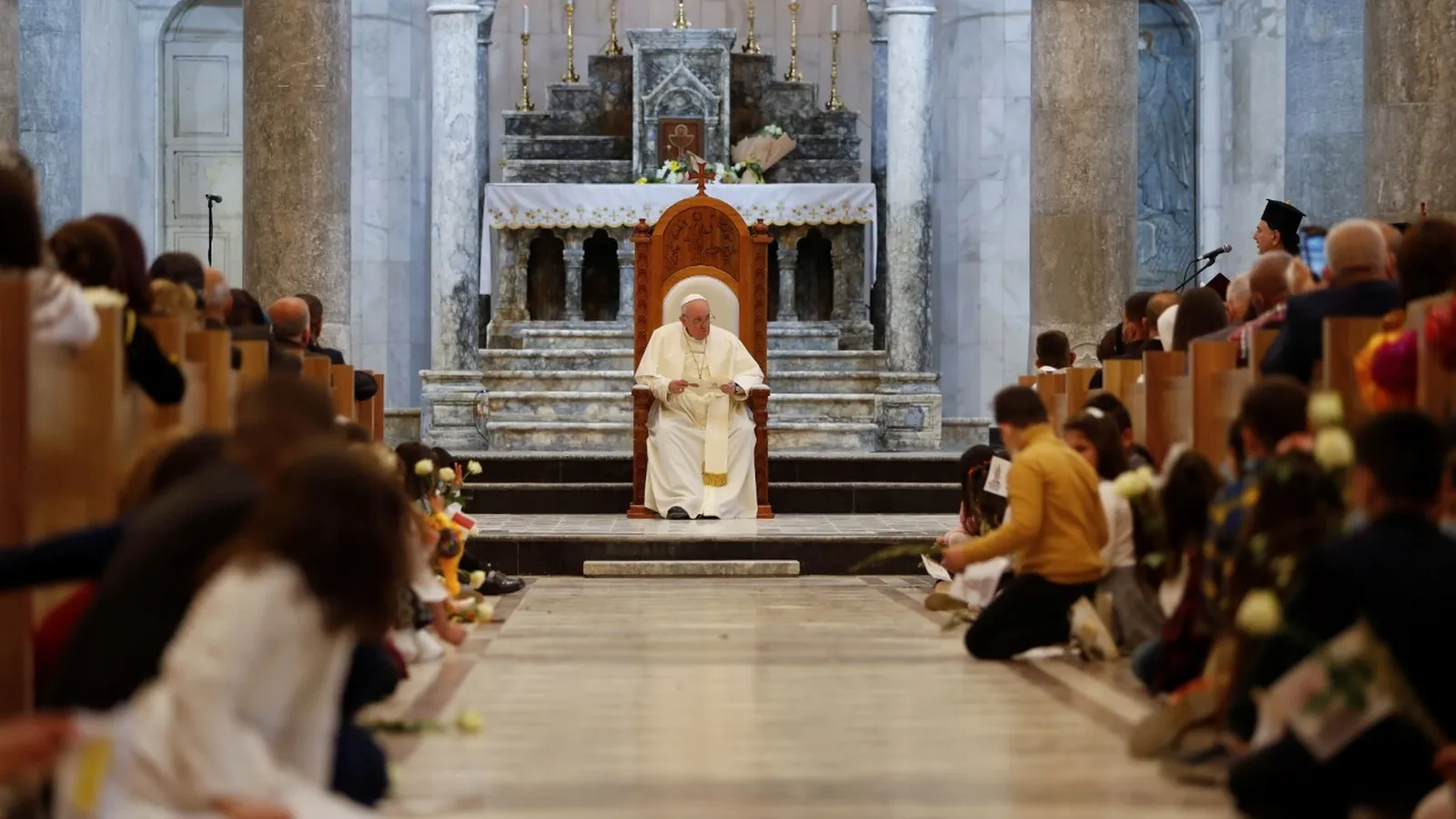 Francisco, el pontífice de los abrazos, vino a cumplir un sueño, largamente esperado, como su visita a Siria, que quién sabe si podrá realizar algún día. "He esperado con impaciencia este momento", subrayó, tras escuchar el saludo de Su Beatitud el Patriarca Ignace Youssif Younan y los testimonios de la señora Doha Sabah Abdallah (con un mensaje en recuerdo de sus seres queridos, entre ellos su hijo, asesinados por el Estado Islámico, y que emocionó especialmente al Papa) y al padre Ammar Yako (quien vivió muy de cerca los ataques terroristas y el exilio de los cristianos de la zona, durante más de tres años). Y ser recibido con cánticos y ramos de olivo.