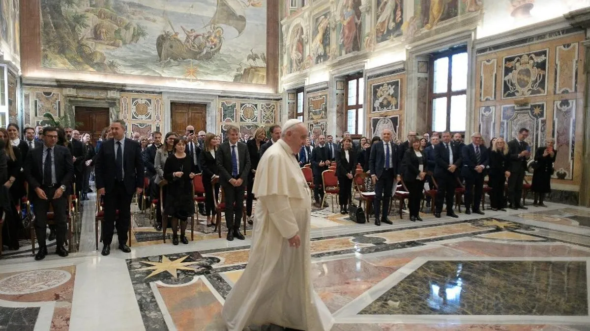 "Por lo tanto, los criterios de gestión y financieros no son el único elemento a tener en cuenta. La cultura del rechazo no debe afectar a su profesión. Y este es otro ámbito en el que debemos estar siempre atentos. "Dios, nuestro Padre, ha dado la tarea de cuidar la tierra no al dinero, sino a nosotros: a los hombres y a las mujeres. ¡Tenemos esta tarea!"